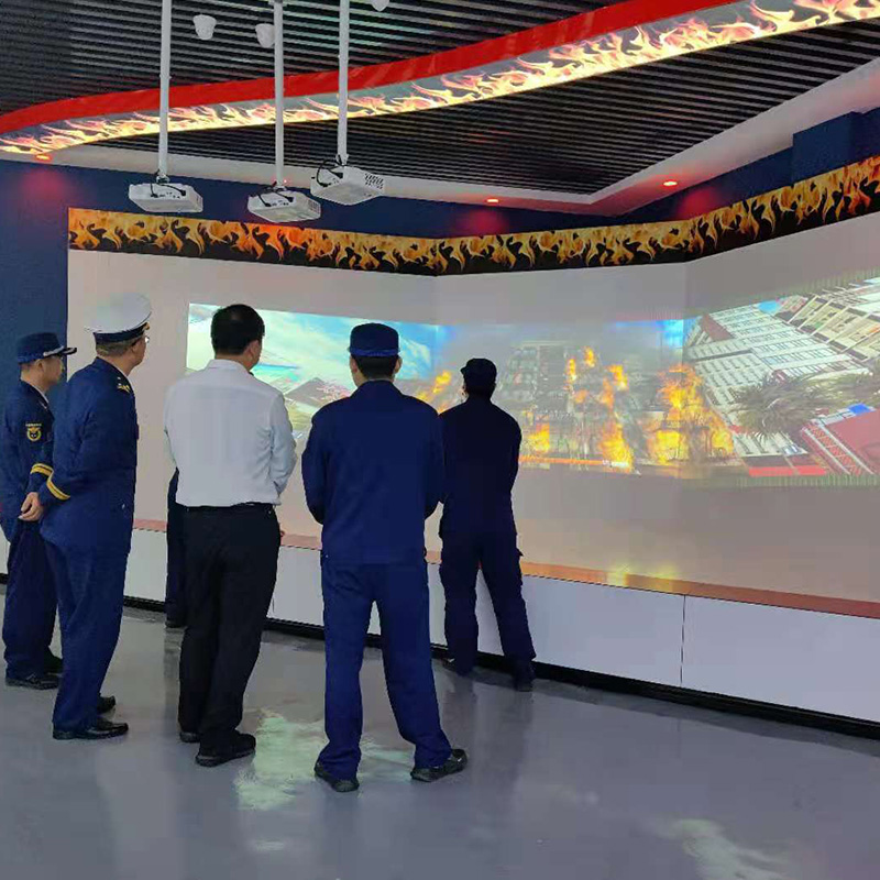 该项目利用大屏投影融合技术,形成大屏投影在墙体,将多种生产安全应用场景内容投影到大屏上,形成接近1:1的真实环境比例,体验人员可以在其中进行互动,用手触控墙体,找到对应的生产安全安全隐患,当找到隐患时,软件播放相关生产安全对应知识,并以动画演示安全隐患内容。