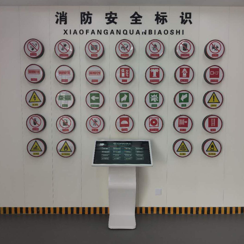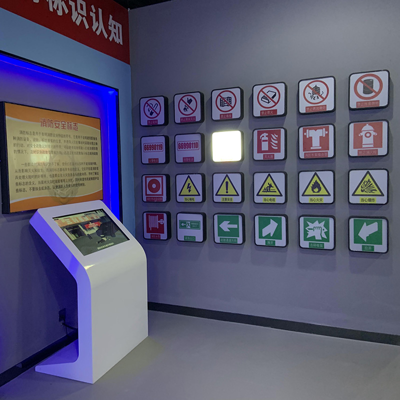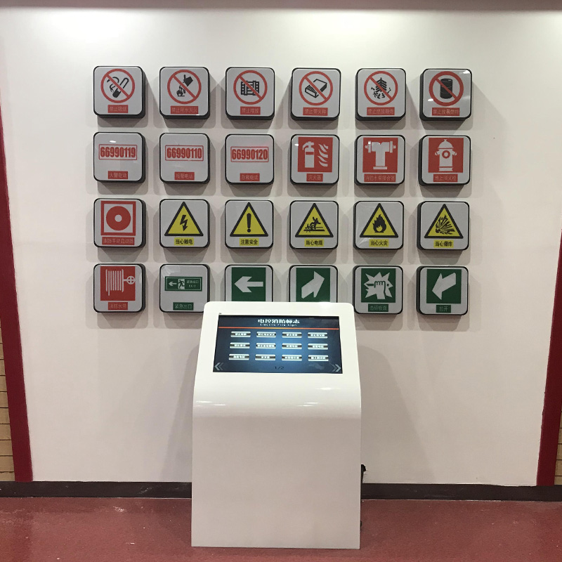 电控安全地标识电控系统,是一款利用计算机软硬件共同结合,采用多媒体为主要展示方式,与硬件标识灯箱共同互动的一种体验设备。当使用者点击不同的消防标志时,多媒体动画进行播放演示对应的标识作用含义。并且实物灯箱高亮,显示该标志的具体图样。可以让体验者深入学习消防标识知识,并在今后的生活中得到更多的安全保障。
