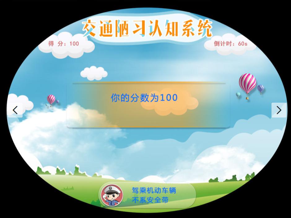 利用体感装置,进行交通漏习的体感认识。屏幕上飞下多种交通标志,交通漏习和交通良习。用户用手进行划破相应的图片,当划到交通标志时会有少量得分,当划到交通漏习时会得到更多的分数,并且系统下方提示对应的交通漏习详细信息,让用户认识相应的漏习,认识其危害,从而在日常生活中,防范交通漏习带来的危害。
