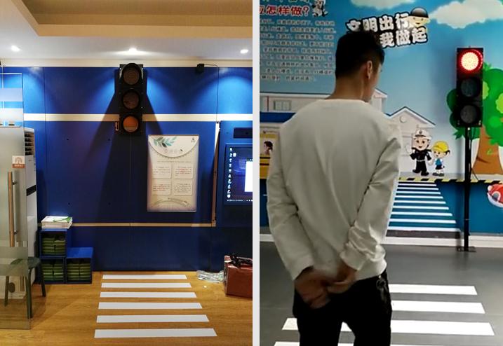 该系统设计目的在于教育学生们,认识红绿灯,理解红绿灯每种颜色灯光表示的意思。系统改装自真实红绿灯,在其基础上加装人体感应装置,在不同灯光颜色下,对行人通过斑马线进行语音提示,让学生在互动中学会红绿灯路口的正确通行方法。
