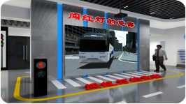 未按照对面红绿灯的指示穿过斑马线,身边大屏幕上突然出现汽车疾驰而来紧急刹车的场景,并且伴随着刺耳的刹车声和玻璃破碎的声音。通过红外线感应装置感应到行人的违法行为,以此来是体验者意识到闯红灯的危害,从而增加其交通安全出行意识。