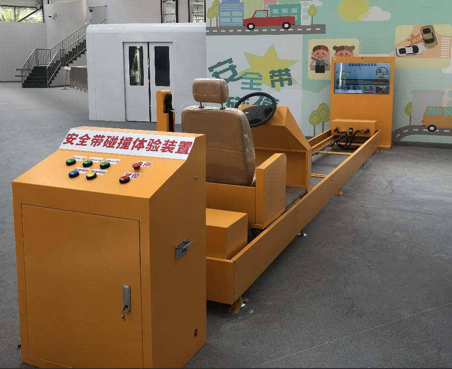 长700cm*宽100cm*高120cm轨道,5km/h、10km/h、15km/h三段速度可选,体验者在小车座椅上坐稳后系带安全带进行碰撞后体验安全带对人体的保护作用