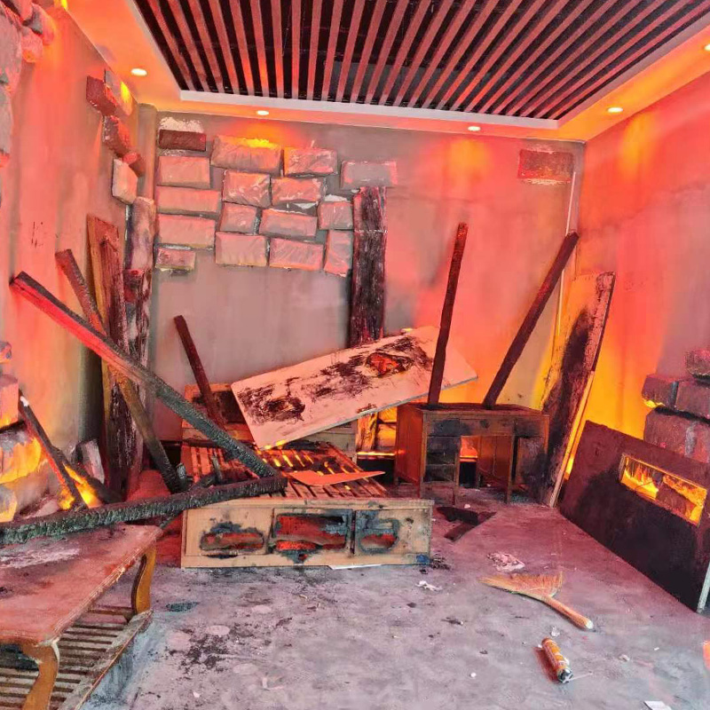 该项目利用一块整体的区域,按照火灾过后的情景进行模拟,在场景内部,制作一些逼真的火焰模拟装置,营造整体火场效果,让人感觉置身于火场之中。