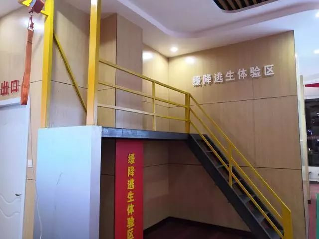 缓降逃生体验区,它是将逃生绳、缓降器和安全吊带三者融为一体的逃生设备,可使逃生人员安全的降落到地面,简单、方便、快捷、并可多次重复使用。在真实现场中可以为更多的被困人员提供逃生机会。市面上的绳索大多外侧采用阻燃材料,内置3毫米的航空钢丝,相对于市面上其他的逃生设备要安全很多。